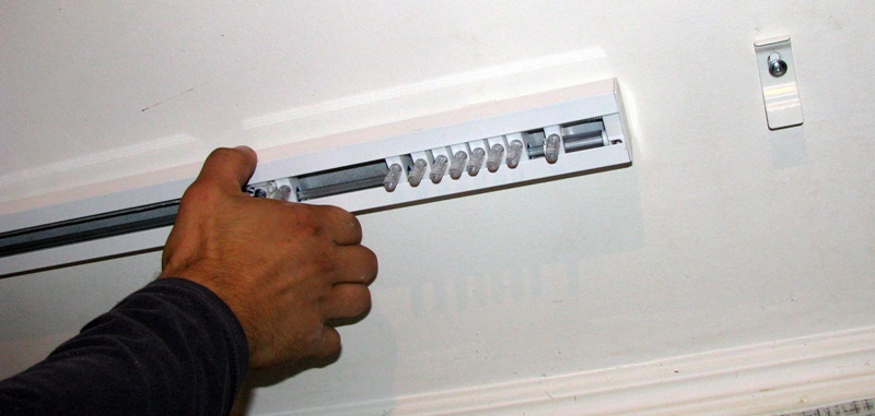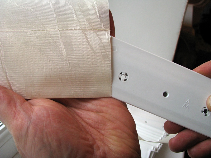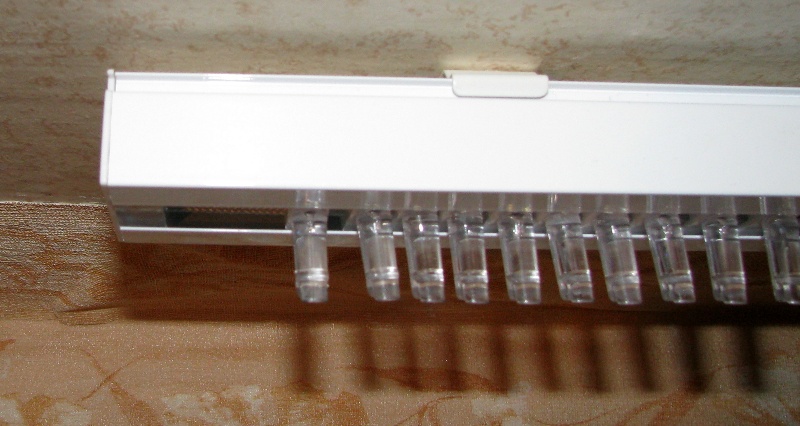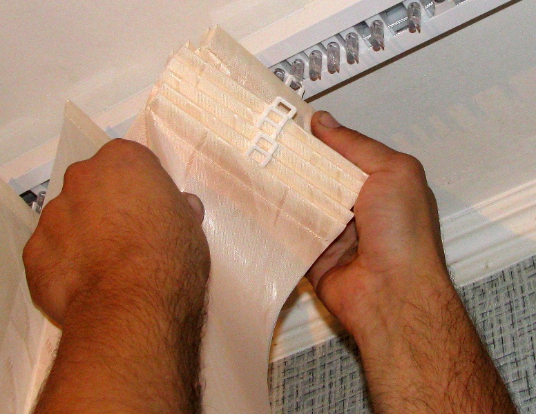 5. Далее берем в руки ламели. Закрепляем ламели на карнизе. Для этого вщелкиваем вешалки в бегунки (смотри фото).