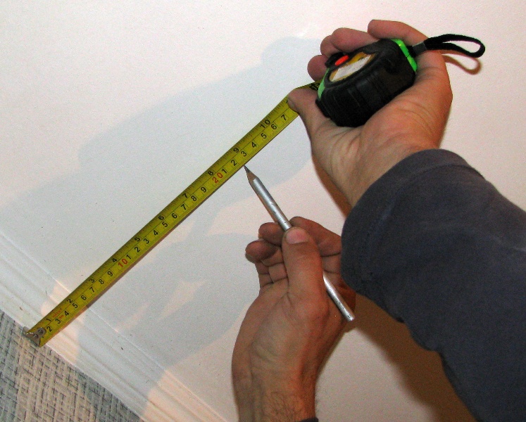 Приступаем к установке. Мы будем крепить вертикальные жалюзи к потолку, поэтому стеновые кронштейны нам не понадобятся. 1. Отмечаем место крепления потолочной клипсы карандашом. В нашем случае расстояние от окна рассчитываем таким образом, чтобы жалюзи закрывали батарею.