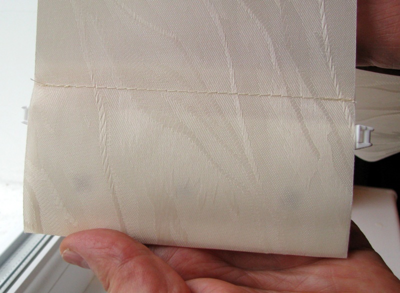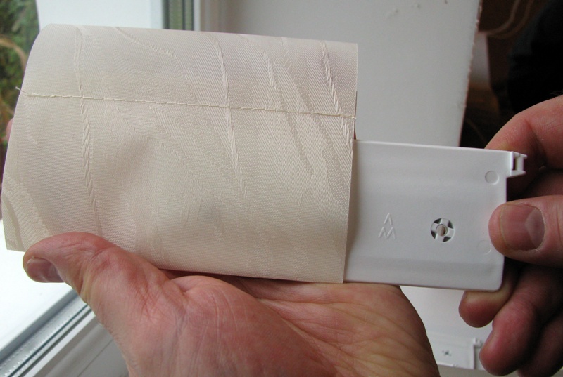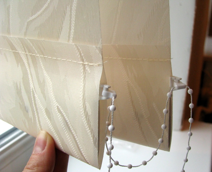 Внизу каждой ламели есть карман для груза. Вставляем грузики в ламели ушками вверх (как на фото).