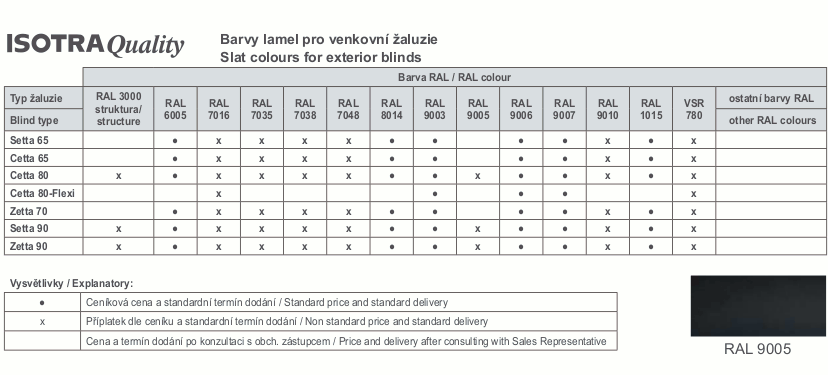 Цветовая гамма ламелей для наружных жалюзи Cetta 80, Setta 90 и Zetta 90 расширена за счёт добавления чёрого цвета (RAL 9005), который можо заказать за дополительую плату. Сроки поставки - стадартые. Для других типов наружых жалюзи этот цвет можно заказывать по предварительной договорёности с торговым представителем компании и по договорной цене.