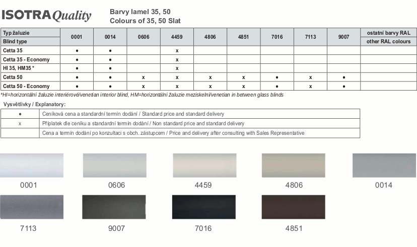Алюминиевые горизонтальные жалюзи с шириой ламели 35 и 50 мм. Изменена цветовая гамма ламелей для жалюзи Cetta 35, 50 - Economy. Стандартные цвета и оттенки за доплату указаны в таблице: