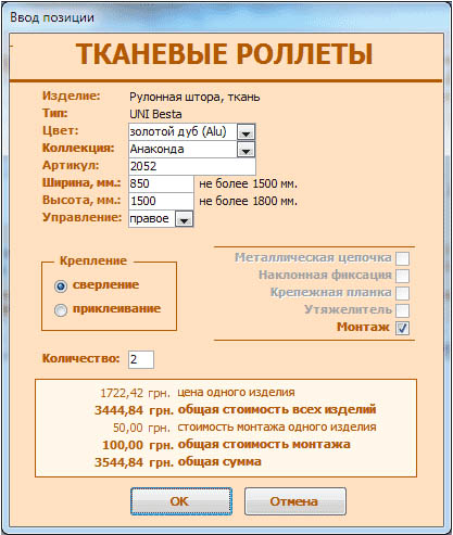 Программа для расчёта стоимости жалюзи.
