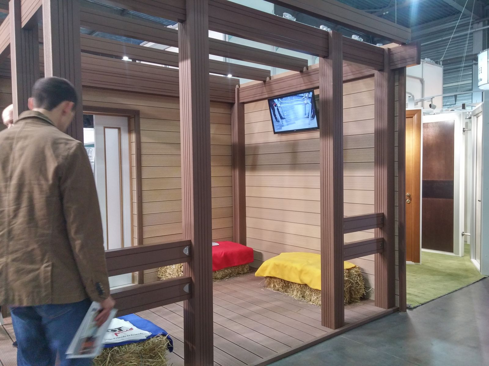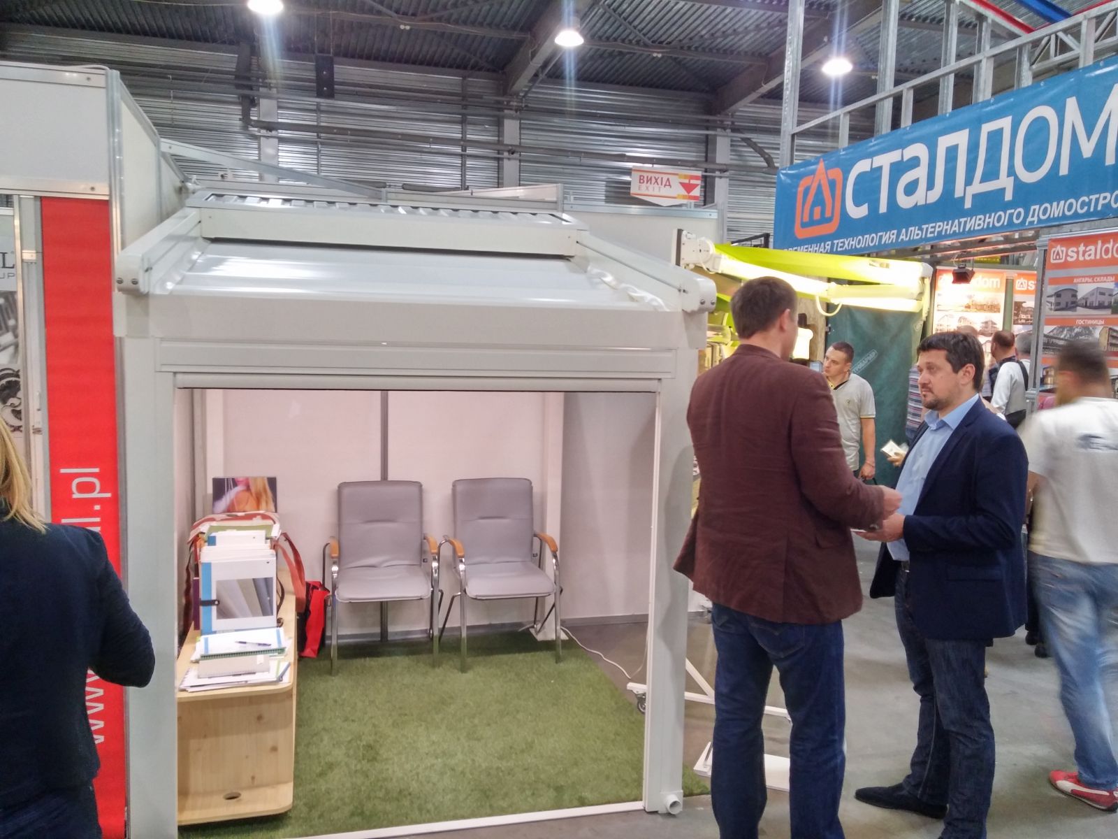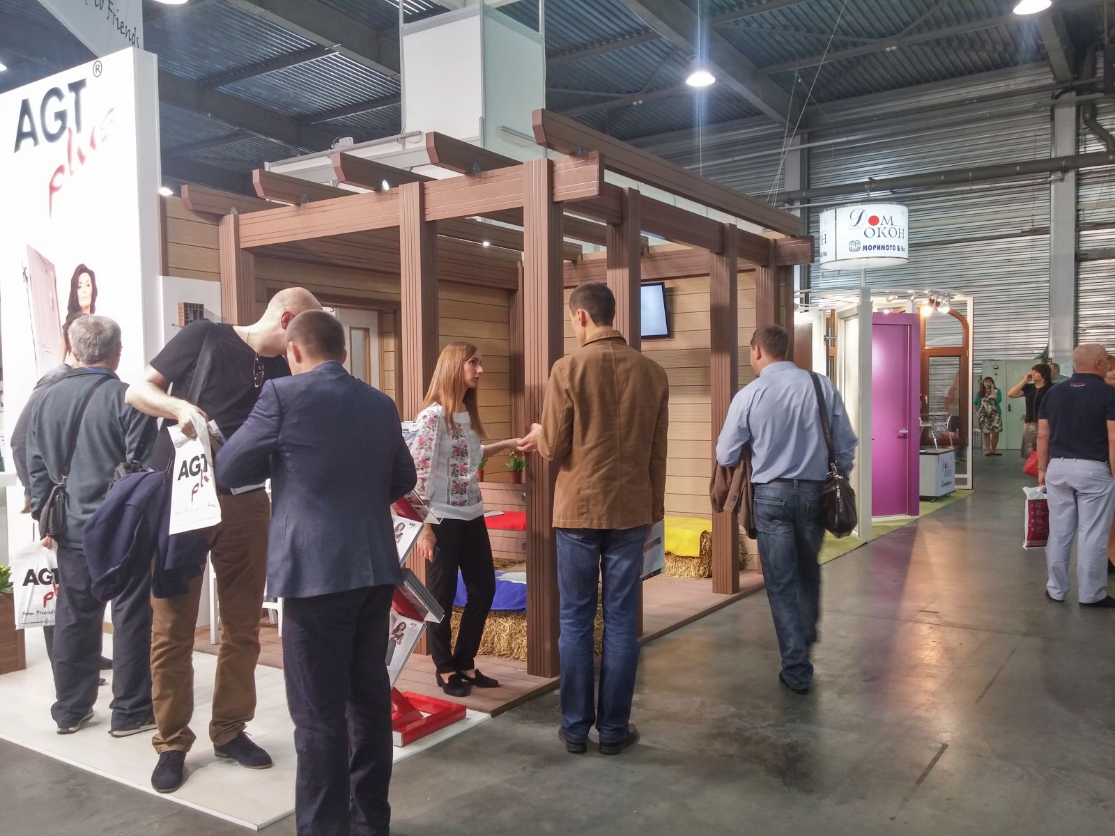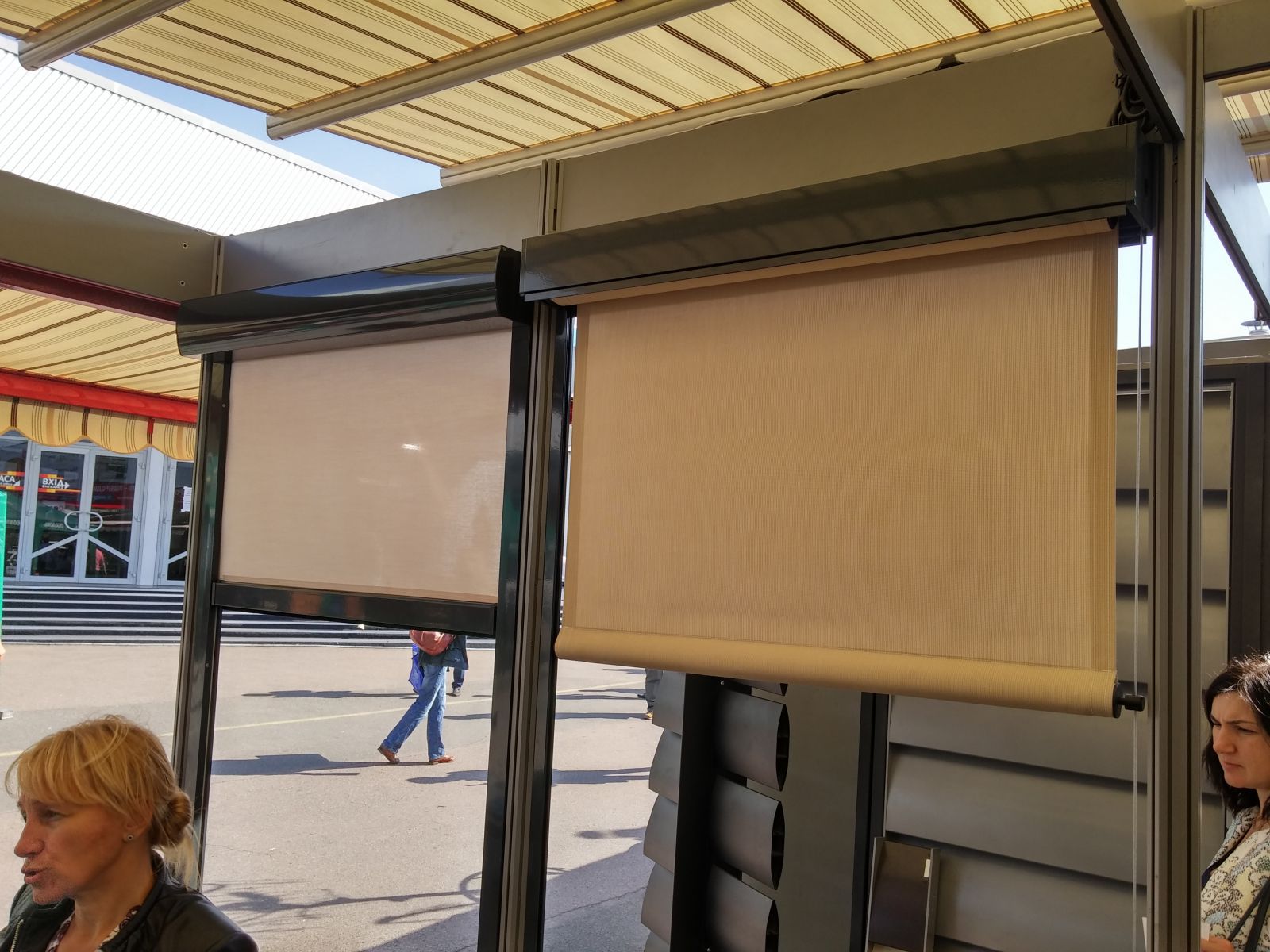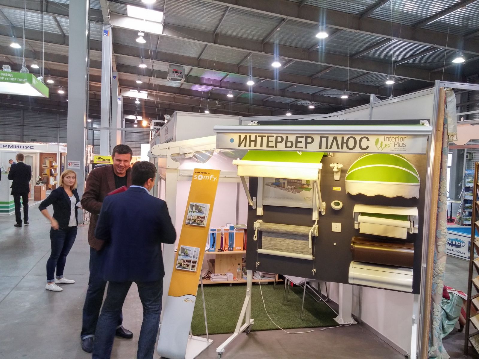 В павильоне - небольшой стенд с наружной солнцезащитой компании "Интерьер Плюс". Конечно - небольшой образец перголы.