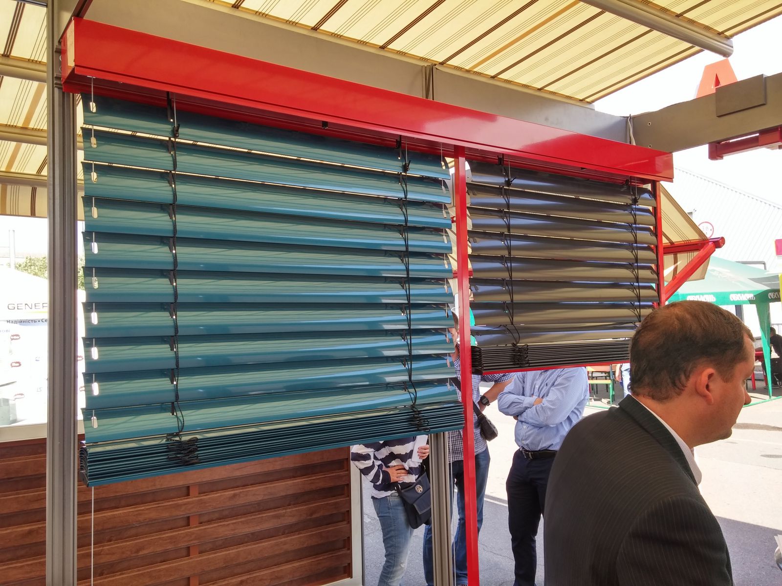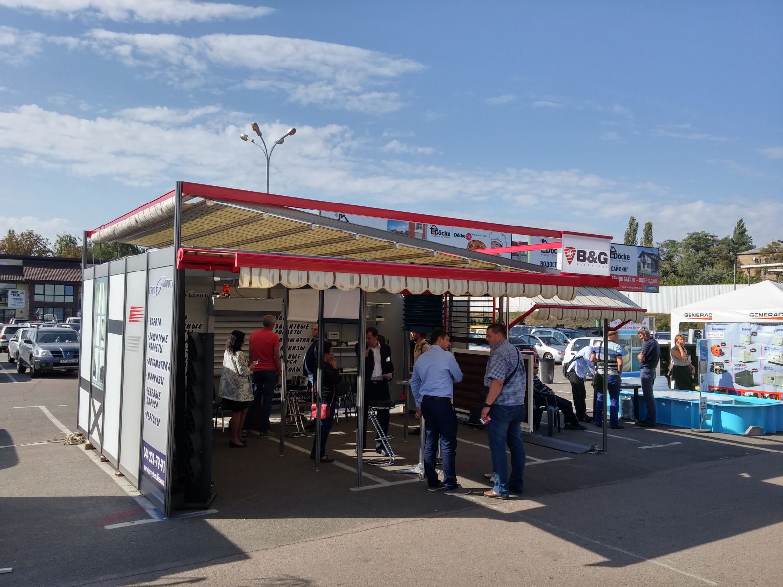 Представлены различные виды ворот и маркиз, а также - рафшторы. Фишка - комплектующие для маркиз и рафштор теперь можно красить в любые цвета по RAL. Качество покраски - отличное. И, конечно, пергольная маркиза - как крыша стенда.