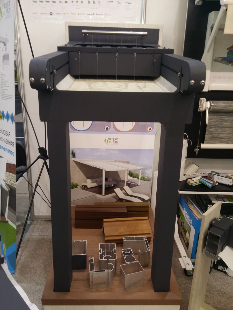 Ещё одной одесской компанией, принимающей участие в выставке, является "Интерьер Плюс". Здесь нет того размаха, к которому мы привыкли по ежегодным выставкам DLT, постоянным участником которых является "Интерьер", но, тем не менее, стенд просторный и довольно информативный. Представлена вся линейка продуктов компании, но основной акцент сделан на внешнюю солнцезащиту и, в частности, - на пергольные системы, которые компания запустила в прошлом году.