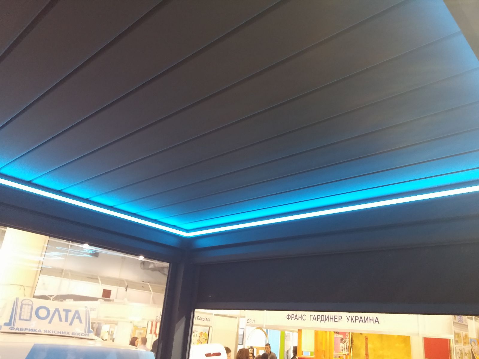 Или компании Solwin, на стенде которой мы увидели конструкцию веранды, очень напоминающую перголу да ещё и с рафшторой на заднем плане, которые компания завозит из Германии под заказ.