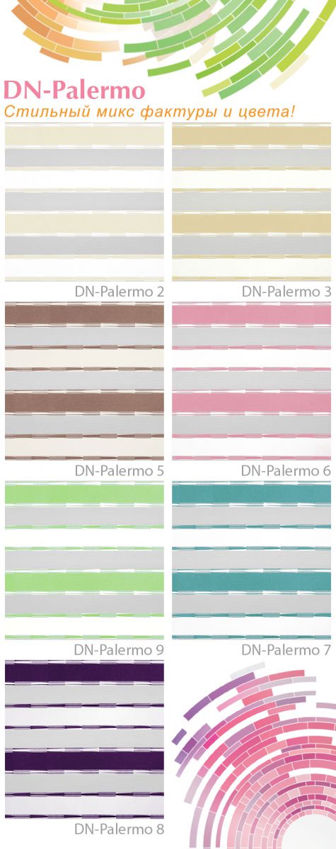Ткани с ярким орнаментом DN-Mexico - этно мотив древней Мексики в сочетании с гофрированной фактурой -  эффектное украшение интерьера. DN-Palermo – стильное двухцветное решение с оригинальной каймой.