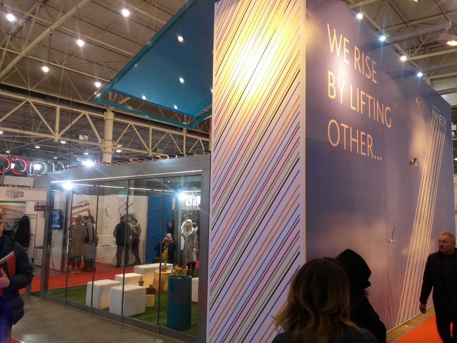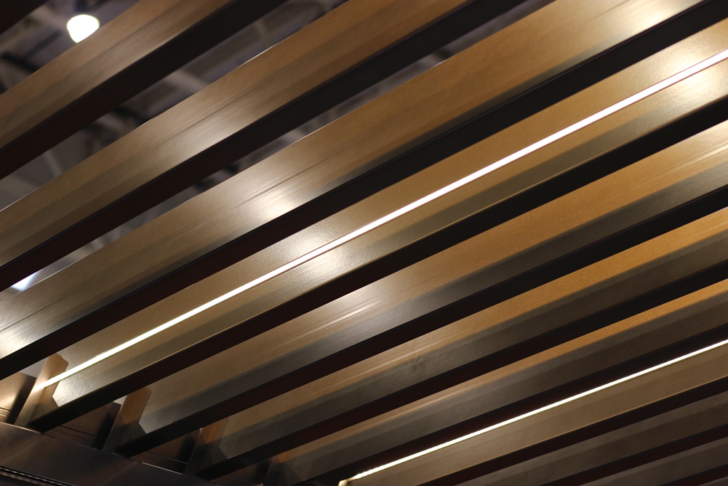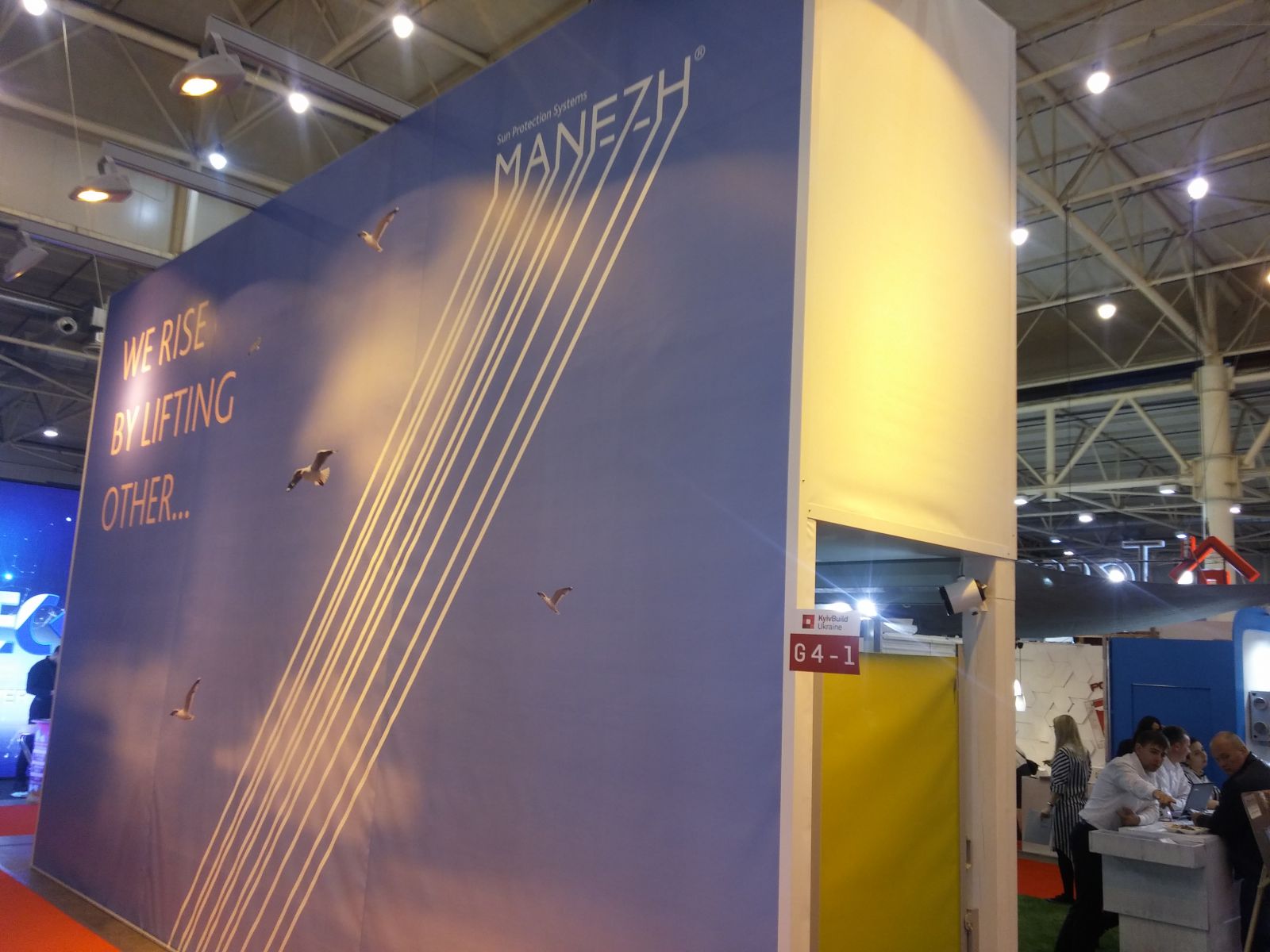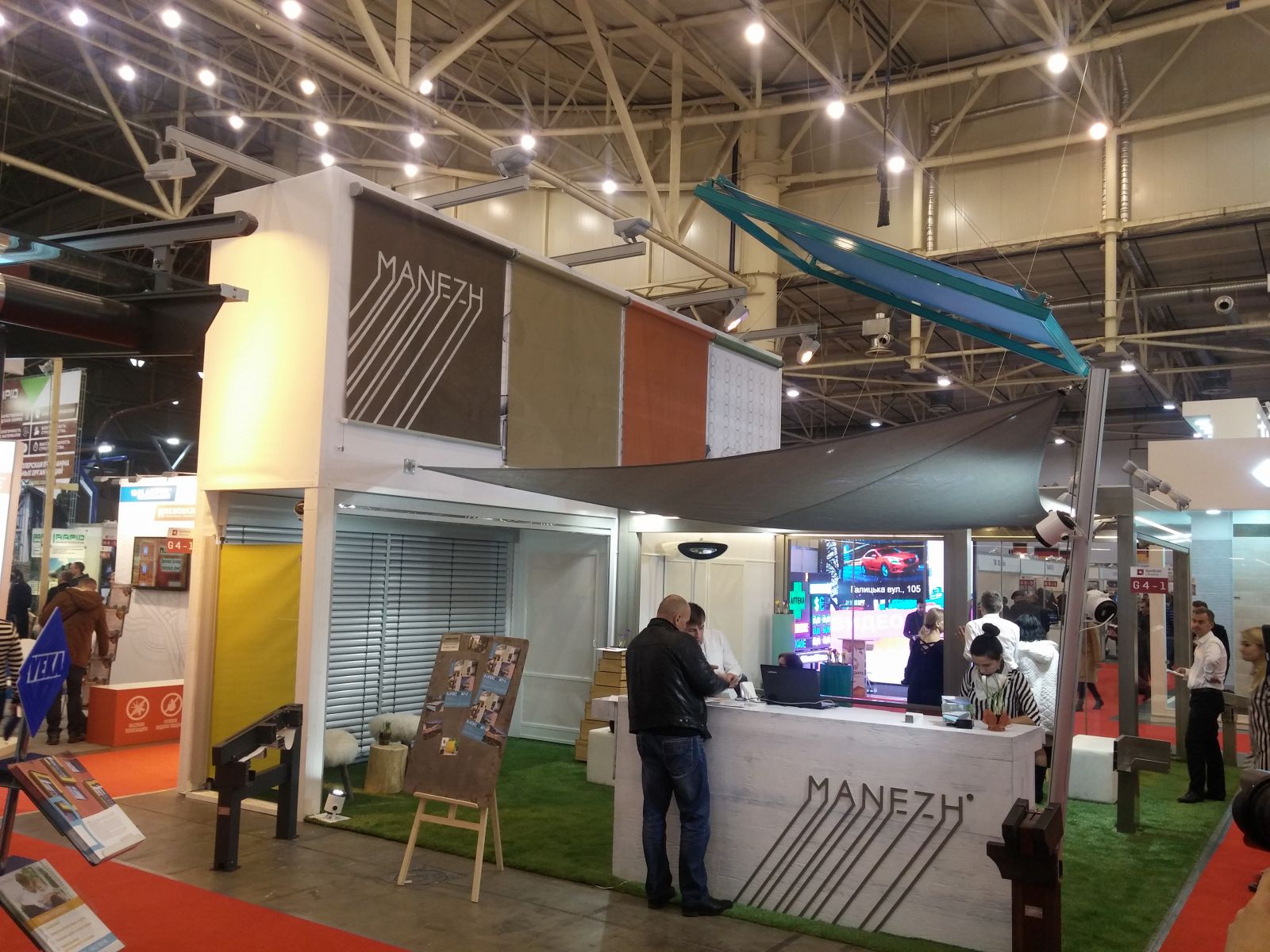 Прежде всего - это компания "Манеж". На стенде было много интересного. Это и пергола с поворотными ламелями на крыше, и ZIP-системы, и боковое остекление пергол с вертикальной и горизонтальной раздвижкой. Также, можно было увидеть образцы рафштор, самостоятельный выпуск которых компания наладила в конце прошлого года. А ещё - интересную вертикальную маркизу, систему для затенения зимних садов и парус, натянутый прямо над стендом. Кроме того, во второй день выставки, руководитель компании Марина Дяченко со своими коллегами проводили семинар по солнцезащитным системам.