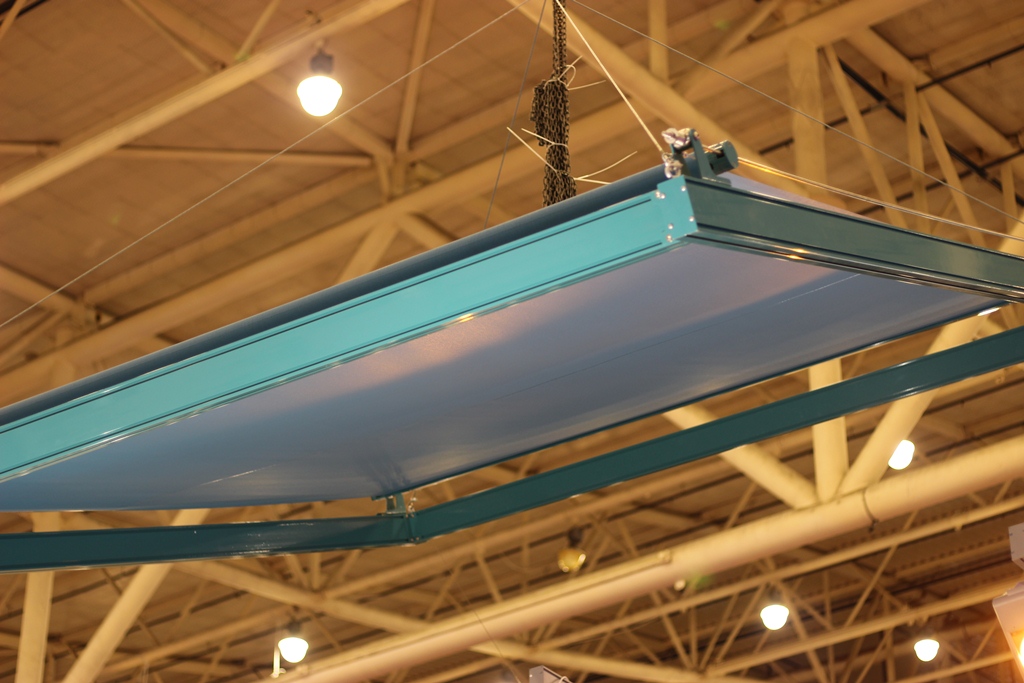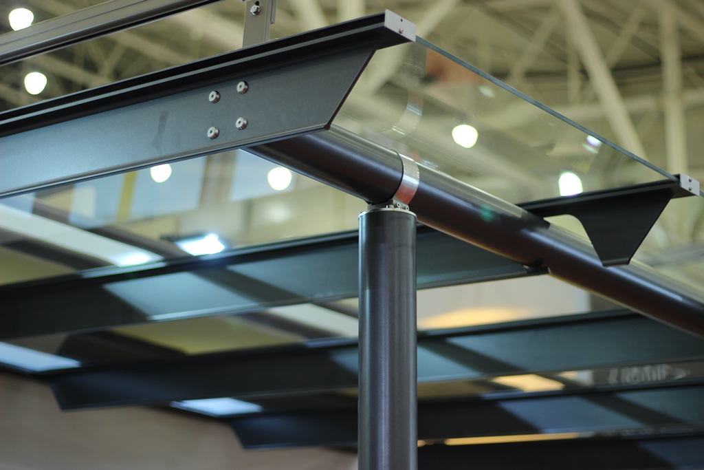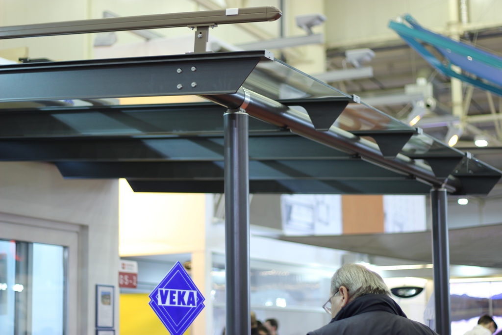 Интересный навес мы увидели на стенде компании "Солвин": над стеклянной крышей, при необходимости, выезжает ткань на электроприводе, по аналогии с системами для затенения зимних садов.