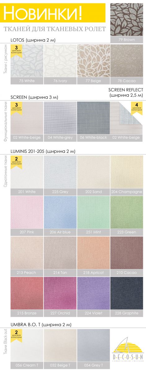 Новые ткани в ассортименте ДекосанаАссортимент тканей для рулонных штор дополнен следующими новинками: