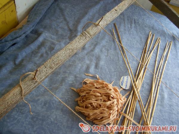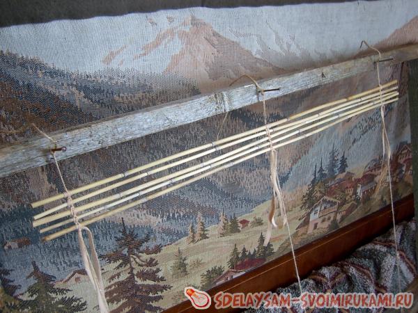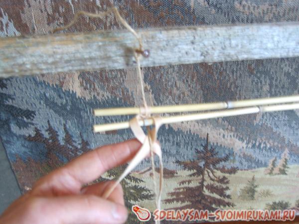 Далее начинаем сборку жалюзи, последовательно привязывая к основе все стебли. Для этого потребуется более тонкий шнур и ваше терпение. В качестве шнура подойдут также тонкие ленточки, которые вы можете получить, разрезав ненужную старую рубашку.